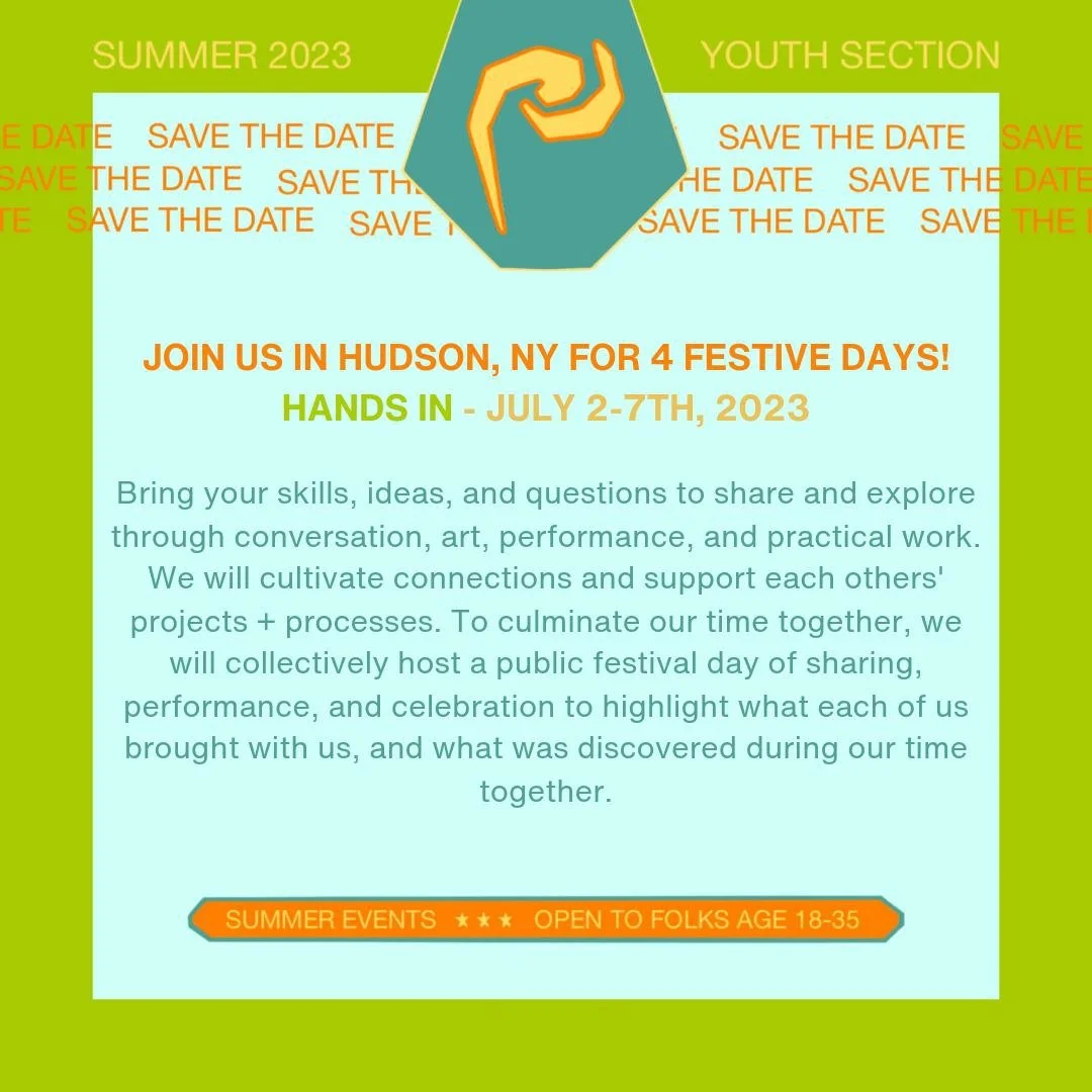 Bring your skills, ideas, and questions to share and explore through conversation, art, performance, and practical work. We will cultivate connections and support each others' projects + processes. To culminate our time together, we will collectively host a public festival day of sharing, performance, and celebration to highlight what each of us brought with us, and what was discovered during our time together.