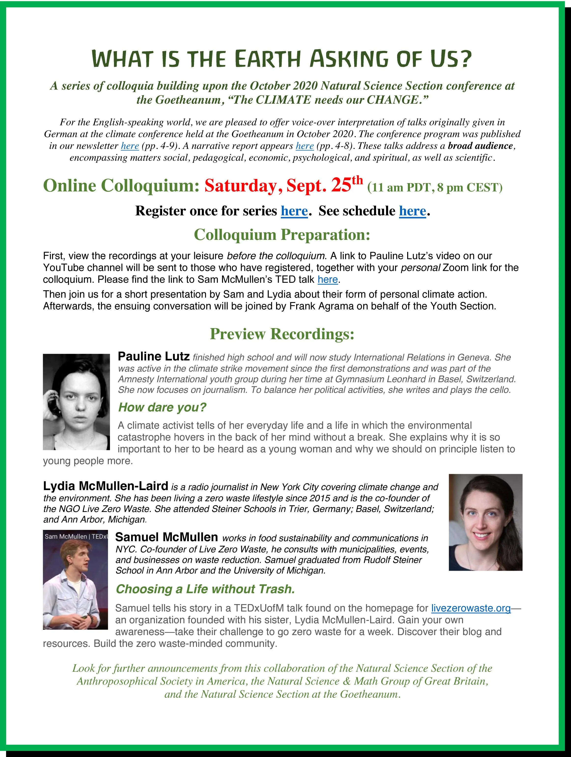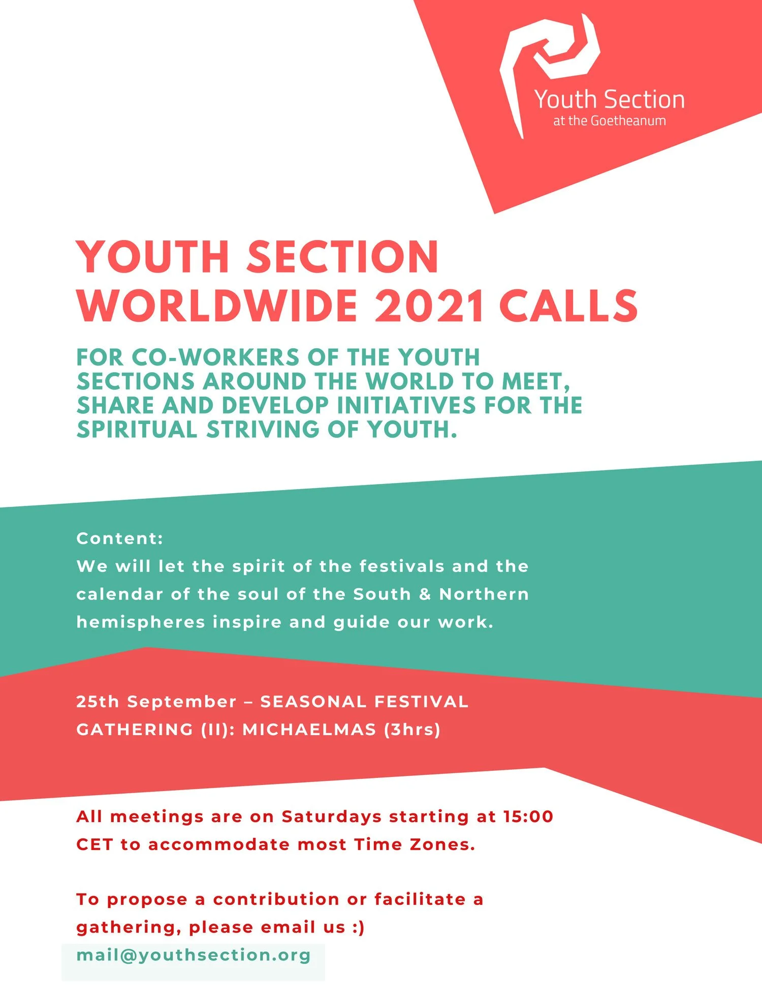 We would like to extend an invitation to our next Youth Section Worldwide Gathering, which will take place this Saturday 25th of September from 15:00 - 18:00 on the theme of Michaelmas. Here is the link to join the call: https://us02web.zoom.us/